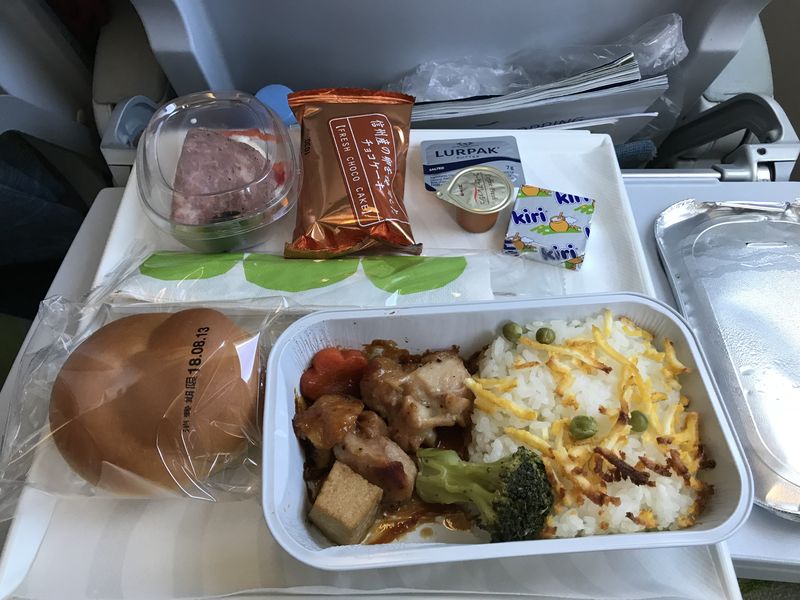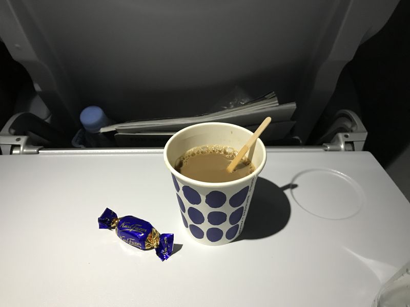 フィンエアーはなかなか小綺麗な機内で、搭乗2時間後に機内食が出てきました。