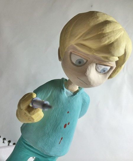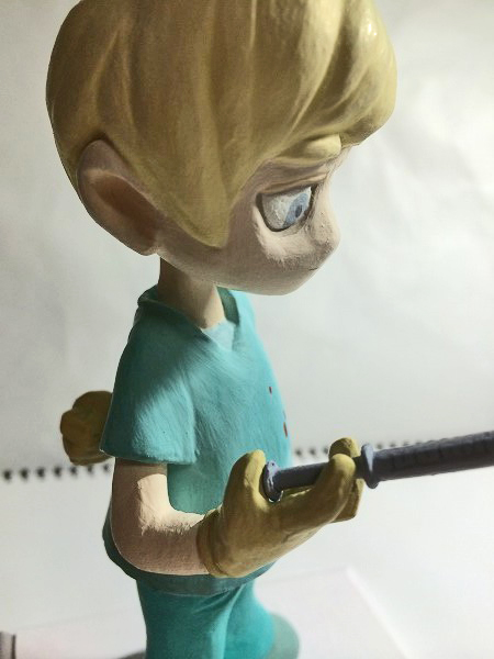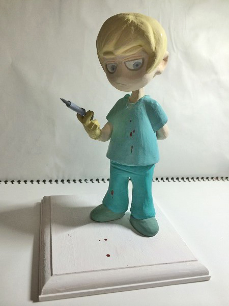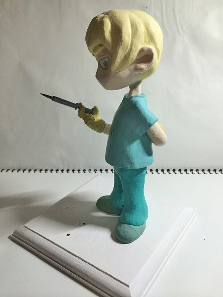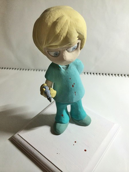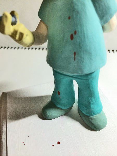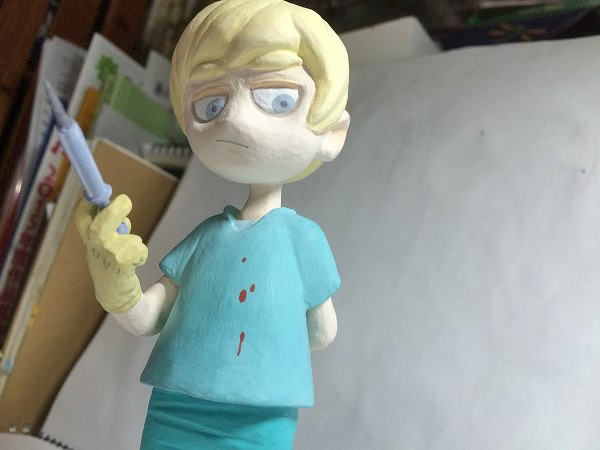 | 特に、下書きみたいなものは気にせずに雰囲気で作り始めたので、気が付いたら手だけデフォルメじゃなくなってしまいました。 他の粘土がわからないのですが、100均粘土はなかなか毛羽立ちます。 注射器は着脱可能。 粘土+綿棒+爪楊枝。 メモリが頑張りポイント…。 |