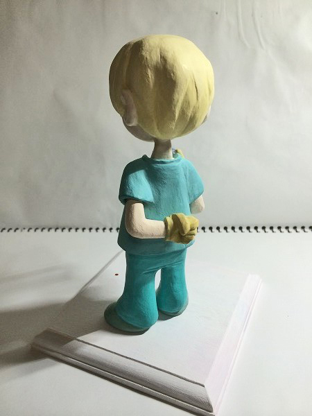 | 頭と、胴体と、腕は別々で作って最後にくっつけました。 頭は首一本で支えられているのみで軸とかは特になかったのですが、結構支えてくれるようです。 乾くと軽い石粉粘土。 |
