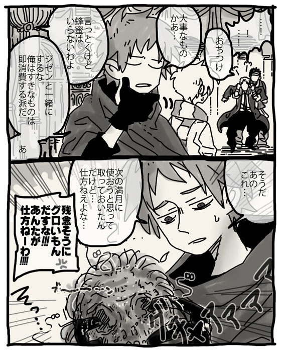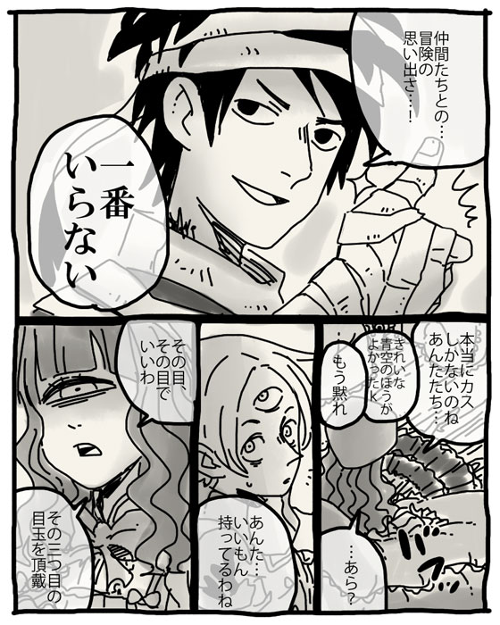 なんつって。これから一波乱ありそうな感じで終わる。 やっとバローナを動かせました。とある1シーンって感じで…。 他人にとってはあまり意味のないアイテムしか持ち合わせないパーティ。 でも本人的には大事。