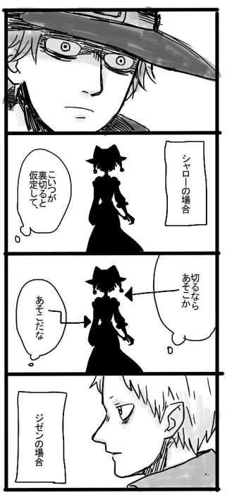 真剣な場面でどうでもいいことを考えるタイプですってジゼンの部分描きたかっただけなんだけど、 意図せず吸血鬼特性だったことに描いた後で気づいた。 カウント伯爵フィーバーしてる真っ最中だったのになぜ気づかなかったんだろう。