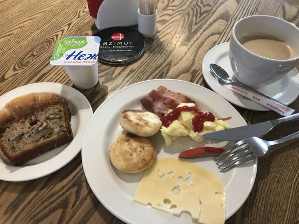 皿の真ん中にある丸っこいものは、おそらくロシアの朝食によくあるチーズパンケーキ的なものかと思って取りましたが、味はそこまで好みではありませんでした。