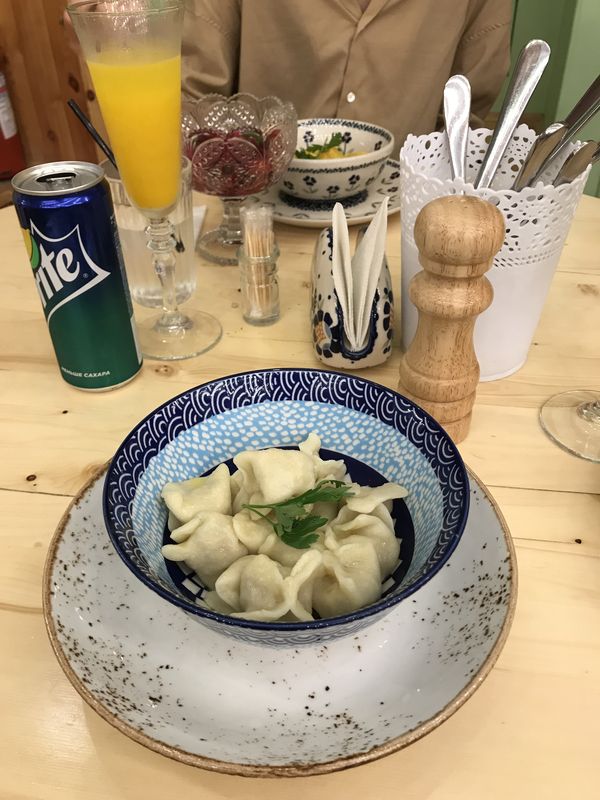 自分は朝食を食べ過ぎたせいもあってあまり空腹ではなく、肉のペリメニを友人とシェアして食べました。