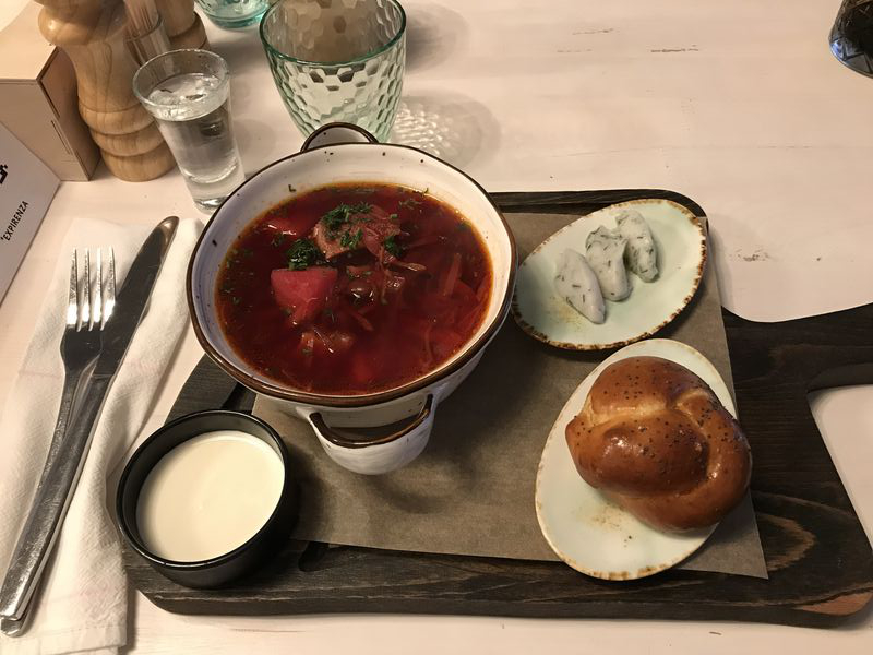 そして、ボルシチはやっぱりオシャレ!パンもおいしいしスメタナをつけて食べてもおいしいし。