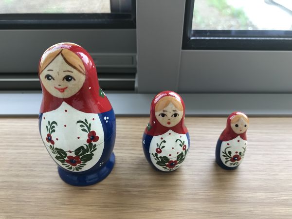 ↓自分が買ったマトリョーシカ。最後のやつの眼が部品が潔く「・」なのがSo Good。